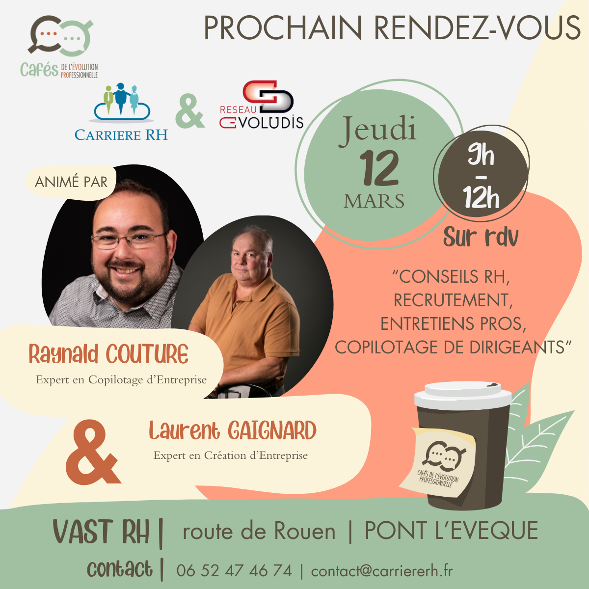 Laurent et Raynald vous donnent rendez-vous le jeudi 12 mars de 9h00 à 12h00 dans nos locaux de Pont-L’Evêque afin de vous présenter les Conseils RH, le Recrutement, les Entretiens Professionnels, et le Copilotage de dirigeants !